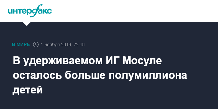 Москва. 1 ноября. INTERFAX.RU - Около 600 тысяч детей все еще остаются в осажденном иракскими военными городе Мосул, сообщили во вторник в международной организации по защите прав детей Save the Children.