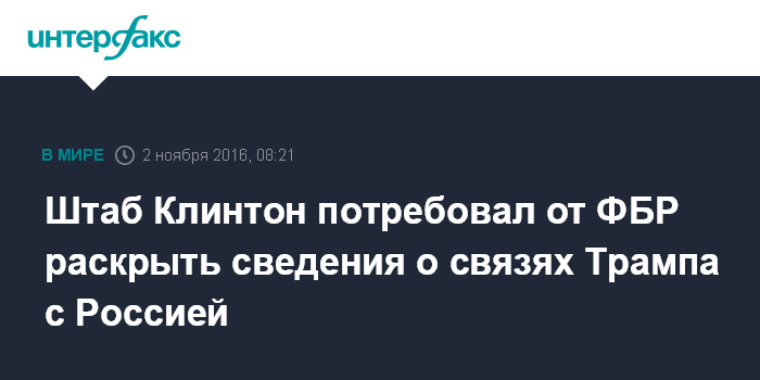 "Если уж вы (ФБР - ИФ) занимаетесь распространением информации о расследовании в отношении кандидата в президенты (Клинтон - ИФ), раскройте все, что у вас есть на Дональда Трампа. Распространите информацию о его связях с россиянами", - заявил Мук в интервью телеканалу CNN. Ранее Клинтон и ее сподвижники активно поднимали вопрос о том, что Россия предпринимает хакерские атаки на ее штаб, чтобы повлиять на результаты президентских выборов в США в пользу Трампа.
