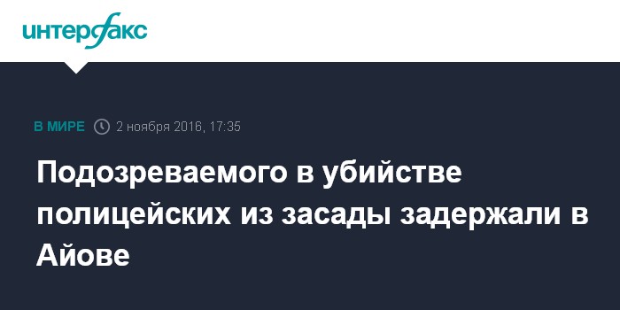 Москва. 2 ноября. INTERFAX.RU - Подозреваемого в убийстве двух полицейских из засады задержали в американском городе Де-Мойн (штат Айова). Об этом сообщает местный канал KCCI со ссылкой на представителя властей.