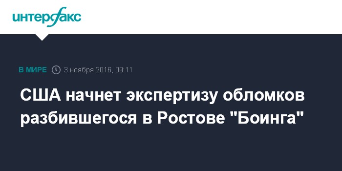 Москва. 3 ноября. INTERFAX.RU - Отдельные фрагменты разбившегося 19 марта в ростовском аэропорту "Боинга" авиакомпании FlyDubai доставлены на экспертизу в США, сообщил "Интерфаксу" источник, знакомый с ходом расследования.