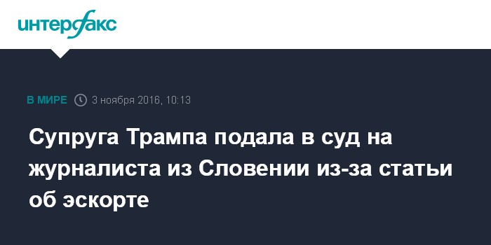 Москва. 3 ноября. INTERFAX.RU - Супруга кандидата в президенты США от республиканцев Мелания Трамп подала в суд на словенского журналиста, который написал, что она сотрудничала с агентством эскорт-услуг, сообщают в четверг западные СМИ со ссылкой на ее адвоката.