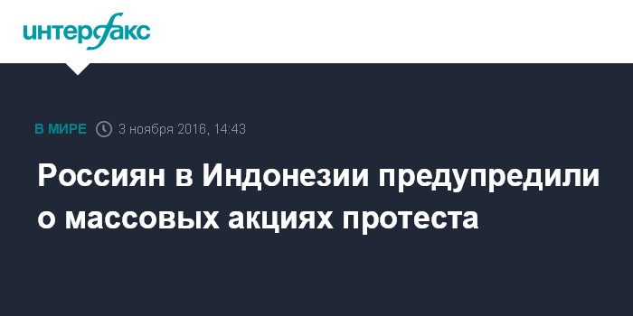 Москва. 3 ноября. INTERFAX.RU - Посольство России в Джакарте рекомендовало находящимся в Индонезии гражданам РФ проявлять бдительность в связи с планируемыми там 4 ноября крупными протестными выступлениями.