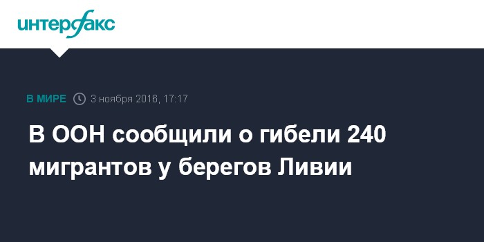 Москва. 3 ноября. INTERFAX.RU - В управлении ООН по делам беженцев заявили о гибели 239 мигрантов у побережья Ливии в результате двух кораблекрушений. Об этом в четверг сообщил представитель организации.
