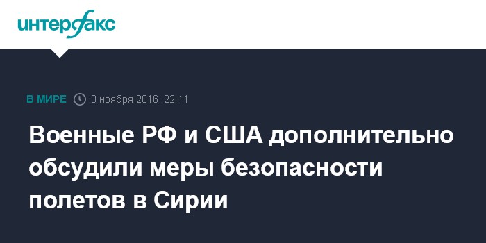 Москва. 3 ноября. INTERFAX.RU - Российские и американские военные в четверг в ходе видеоконференции обсудили безопасность полетов авиации в Сирии, сообщили "Интерфаксу" в департаменте информации и массовых коммуникаций Минобороны России. Видеоконференция состоялась по инициативе американской стороны, заявили в Минобороны РФ.