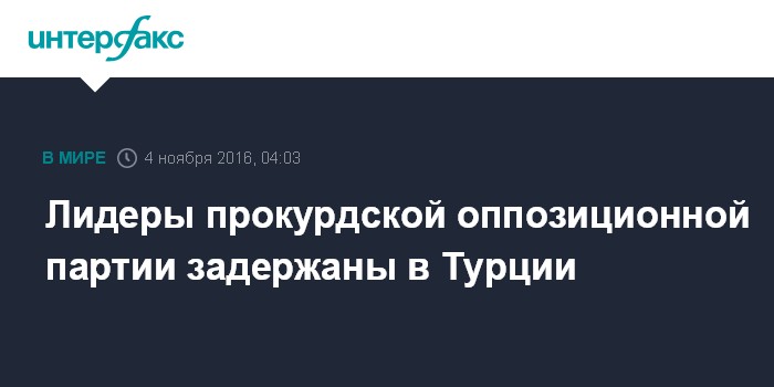 Москва. 4 ноября. INTERFAX.RU - Два сопредседателя прокурдской оппозиционной "Партии демократии народов" (ПДН) задержаны турецкими властями, сообщает в пятницу BBC. Селахаттин Демирташ был задержан у себя дома в городе Диярбакыр на юго-востоке страны, Фиген Юксекдаг взята под стражу в Анкаре. Вместе с партийными лидерами арестованы по меньшей мере пятеро депутатов парламента от ПДН.