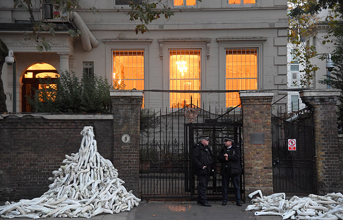 Отмечается, что 3 ноября, группа демонстрантов блокировала работу посольства: вход в консульский отдел был завален частями от манекенов, а протестующие приковали себя к входу в дипучреждение.