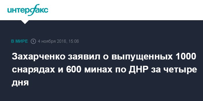 Москва. 4 ноября. INTERFAX.RU - Несмотря на минские договоренности и попытки разведения сторон с 31 октября по 3 ноября на территории самопровозглашенной Донецкой народной республики (ДНР) упало 1000 снарядов и 600 мин, заявил глава ДНР Александр Захарченко.