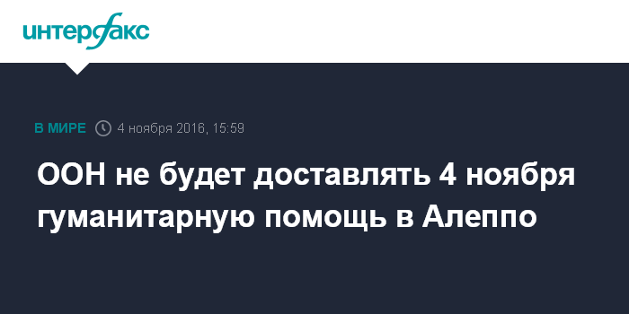 Москва. 4 ноября. INTERFAX.RU - В ООН заявили, что не будут пытаться в пятницу доставить гуманитарную помощь в Алеппо, поскольку считают это слишком, сообщают европейские СМИ.