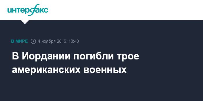 Москва. 4 ноября. INTERFAX.RU - Стрельба близ военной базы в Иордании привела к гибели трех военнослужащих армии США, сообщают западные СМИ со ссылкой на американские официальные лица.
