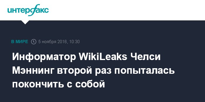 Москва. 5 ноября. INTERFAX.RU - Бывший американский рядовой Брэдли Мэннинг, ныне известный как Челси Мэннинг, передававший информацию WikiLeaks, пытался второй раз покончить жизнь самоубийством, сообщает в субботу британская "Би-би-си".