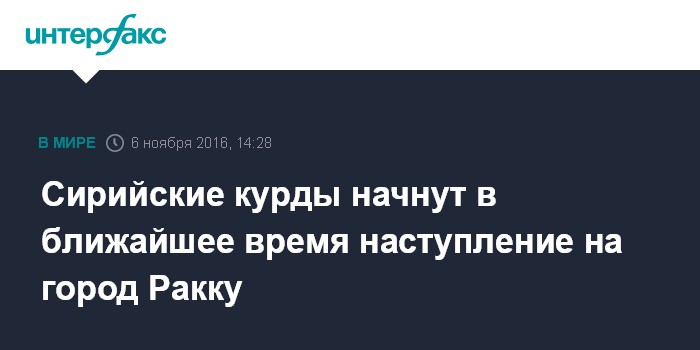 Москва. 6 ноября. INTERFAX.RU - Сирийские курды, которых поддерживают США, объявили о намерении в ближайшее время начать наступление на цитадель "Исламского государства" (ИГИЛ - террористическая организация, запрещенная в РФ) в Сирии, город Ракку.