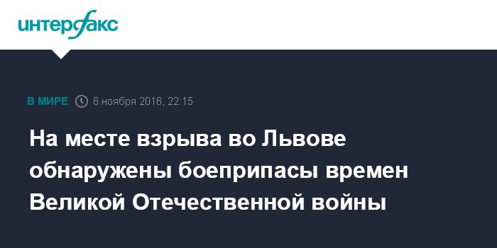 Москва. 6 ноября. INTERFAX.RU - Причиной взрыва в многоэтажном доме во Львове (Украина) стал не бытовой газ, а боеприпасы, сообщила в эфире канала 112.Украина начальник отдела коммуникации главного управления Нацполиции во Львовской области Светлана Добровольская.