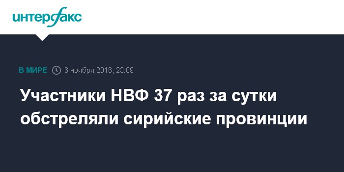 "За сутки зафиксировано 37 обстрелов со стороны незаконных вооруженных формирований в провинциях Дамаск (16), Алеппо (15), Эль-Кунейтра (2), Деръа (2), Латакия (1) и Хама (1)", - говорится в бюллетене российского Центра по примирению враждующих сторон в Сирии.