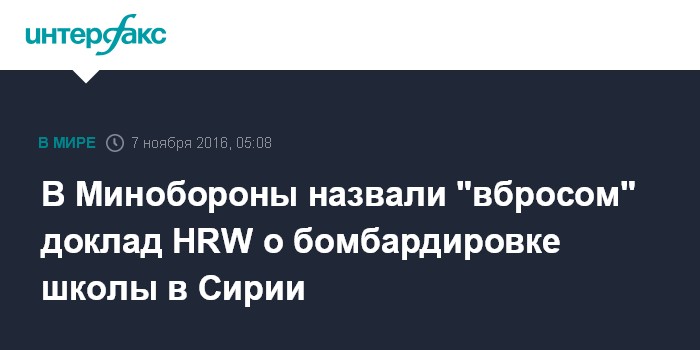 Москва. 7 ноября. INTERFAX.RU - В министерстве обороны России прокомментировали очередной доклад Human Rights Watch, из которого следует, что якобы имевшая место 26 октября бомбардировка школы в сирийском Аль-Хас, провинция Идлиб, может представлять "военное преступление".