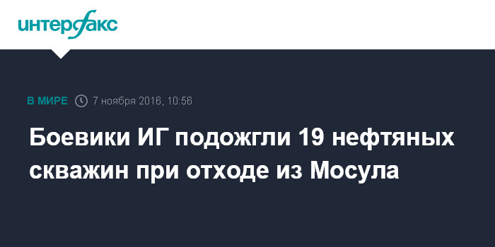 Москва. 7 ноября. INTERFAX.RU - Боевики экстремистского движения "Исламское государство" (ИГ - террористическая организация, запрещенная в РФ), отступающие из южных пригородов Мосула в Ираке, подожгли 19 нефтяных скважин, сообщает "Би-би-си".
