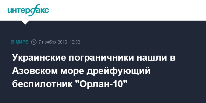 Москва. 7 ноября. INTERFAX.RU - Оперативные сотрудники Мариупольского отряда морской охраны обнаружили в минувшее воскресенье в Азовском море беспилотный комплекс типа "Орлан-10" российского производства.