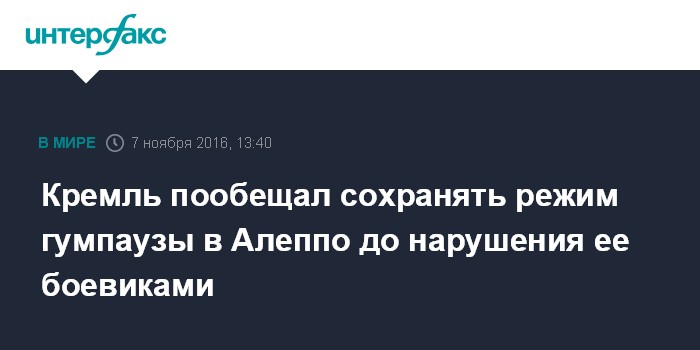 Кремль пообещал сохранять режим гумпаузы в Алеппо до нарушения ее боевиками