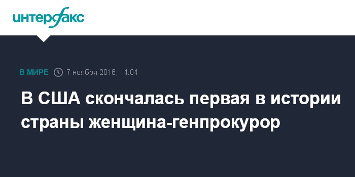 Москва. 7 ноября. INTERFAX.RU - Первая в истории США женщина-генеральный прокурор Джэнет Рено скончалась на 79-м году жизни, передает в понедельник агентство AP.