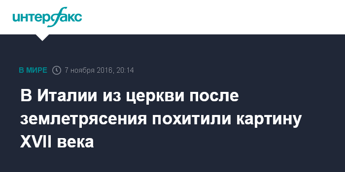 Москва. 7 ноября. INTERFAX.RU - Стражи порядка Италии расследуют дело о похищении картины XVII века из церкви, пострадавшей после землетрясения в конце октября, сообщает агентство AP.