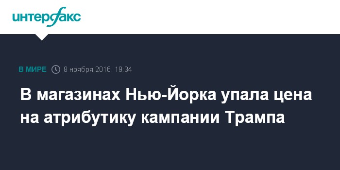 Москва. 8 ноября. INTERFAX.RU - Атрибутика с символикой избирательной кампании кандидата в президента США Дональда Трампа в ряде магазинов Нью-Йорка подешевела почти на треть в день голосования.