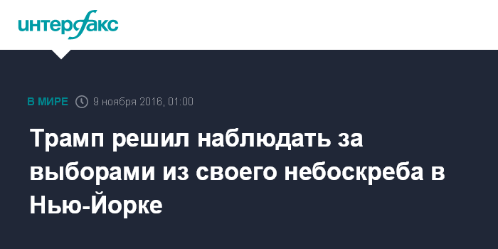 Москва. 9 ноября. INTERFAX.RU - Кандидат в президенты США от республиканцев Дональд Трамп сообщил, что вместе с семьей и друзьями будет следить за результатами выборов из нью-йоркского небоскреба Trump Tower.