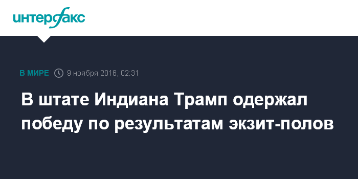 Москва. 9 ноября. INTERFAX.RU - Кандидат в президенты США от республиканцев Дональд Трамп после подсчета первых голосов побеждает и в штате Индиана, сообщает американское телевидение со ссылкой на результаты опросов на выходе с избирательных участков.