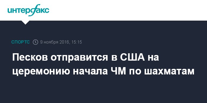 Москва. 9 ноября. INTERFAX.RU - Замглавы администрации - пресс-секретарь президента РФ Дмитрий Песков отправляется в среду в США, где в качестве председателя Попечительского совета Российской шахматной федерации (РШФ) намерен присутствовать на начале матча за звание чемпиона мира по шахматам среди мужчин.