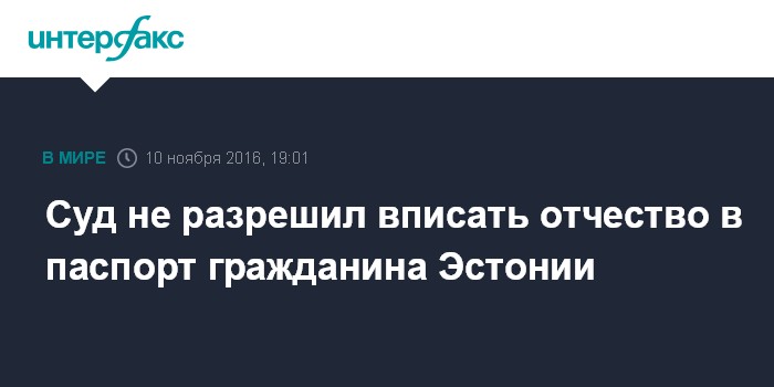 Москва. 10 ноября. INTERFAX.RU - Таллинский окружной суд оставил в четверг без изменения решение Таллинского административного суда, признавшего правомерным отказ Департамента полиции и погранохраны вписать отчество в паспорт гражданина Эстонии.