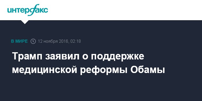Москва. 12 ноября. INTERFAX.RU - Избранный президент США Дональд Трамп заявил в интервью, что он намерен оставить в силе ключевые части законопроекта о здравоохранении президента Барака Обамы, передает BBC.