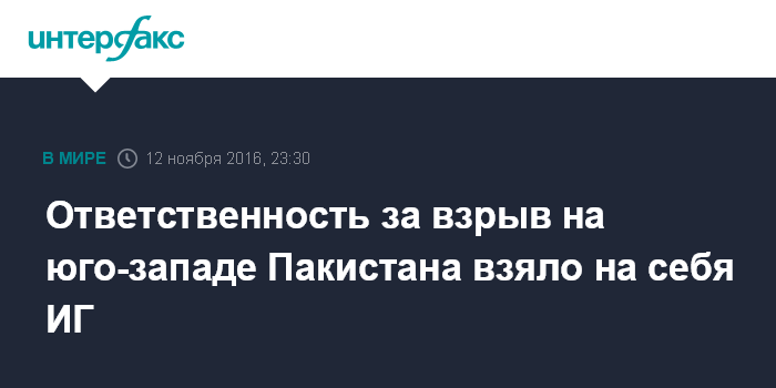 Москва. 12 ноября. INTERFAX.RU - Террористическая группировка "Исламское государство" (запрещена в России) взяла на себя ответственность за взрыв в суфийской мечети на юго-западе Пакистана, сообщает BBC.