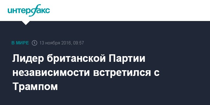 Москва. 13 ноября. INTERFAX.RU - Председатель Партии независимости Великобритании (UKIP) Найджел Фарадж провел встречу с избранным президентом США Дональдом Трампом, сообщает CNN.