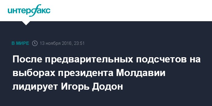 Москва. 13 ноября. INTERFAX.RU - Пророссийский кандидат Игорь Додон, вероятнее всего, одержал победу на выборах президента Молдавии, свидетельствуют предварительные данные Центральной избирательной комиссии.