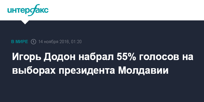 Москва. 14 ноября. INTERFAX.RU - Пророссийский кандидат Игорь Додон одержал убедительную победу на выборах президента Молдавии, он получил около 55% голосов избирателей, а его оппонент - единый кандидат от правых проевропейских партий Майя Санду - 45%, свидетельствуют предварительные данные Центральной избирательной комиссии.