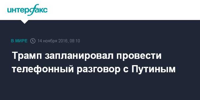 Москва. 14 ноября. INTERFAX.RU - Победитель президентских выборов в США Дональд Трамп заявил в интервью The Wall Street Journal, что планирует вскоре провести телефонный разговор с президентом России Владимиром Путиным.