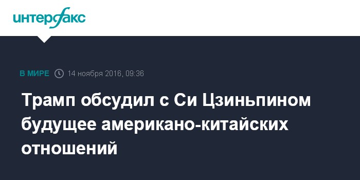 Москва. 14 ноября. INTERFAX.RU - Состоявшаяся телефонная беседа избранного президента США Дональда Трампа с председателем КНР Си Цзиньпином продемонстрировала взаимное уважение сторон друг к другу, заявляют в администрации будущего американского лидера.
