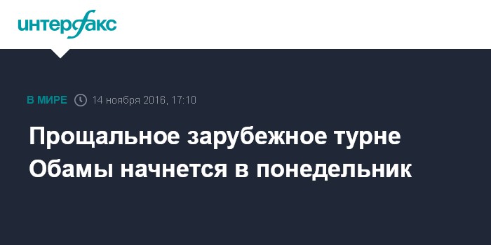 Москва. 14 ноября. INTERFAX.RU - Президент США Барак Обама 14 ноября отправляется в прощальное зарубежное турне в должности главы государства. По сообщению Белого дома, в период до 20 ноября он посетит Грецию, Германию и Перу.
