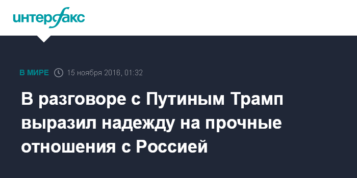 Москва. 15 ноября. INTERFAX.RU - Избранный президент США Дональд Трамп в ходе телефонного разговора с президентом РФ Владимиром Путиным заявил, что рассчитывает на прочные отношения с Россией. Соответствующее заявление по итогам переговоров распространила переходная администрация Трампа, пишет в понедельник The Washington Post.
