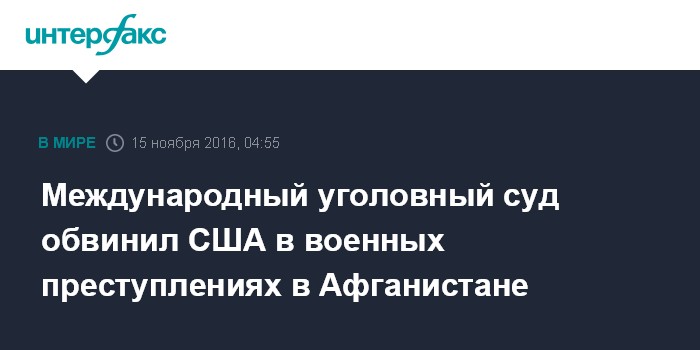 Москва. 15 ноября. INTERFAX.RU - Международный уголовный суд (МУС) считает, что американские войска и ЦРУ виновны в совершении военных преступлений в Афганистане. Об этом в понедельник заявила прокурор МУС Фату Бенсуда, предоставляя ежегодный доклад о результатах предварительного расследования.