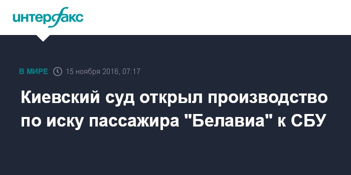 Москва. 15 ноября. INTERFAX.RU - Окружной административный суд Киева открыл производство по иску гражданина Армении Армена Мартиросяна к Службе безопасности Украины по поводу инцидента с самолетом компании "Белавиа", сообщила во вторник пресс-служба суда.
