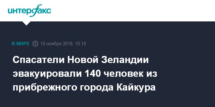 Москва. 15 ноября. INTERFAX.RU - Спасательные службы Новой Зеландии на военных вертолетах эвакуировали 140 человек из города Кайкура на восточном побережье Южного острова после мощного землетрясения, сообщает вторник новозеландская газета New Zealand Herald со ссылкой на министерство обороны страны.