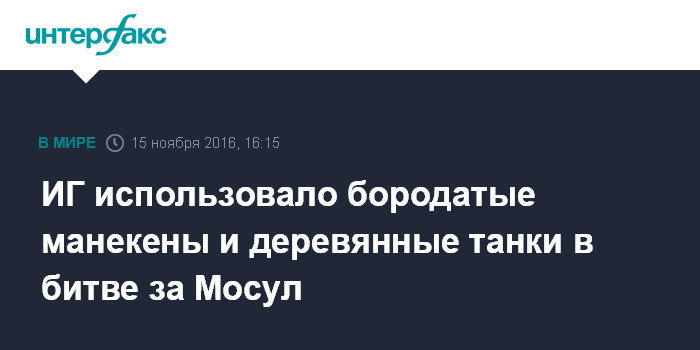 Москва. 15 ноября. INTERFAX.RU - Боевики террористической группировки "Исламское государство" (ИГ, запрещена в России) использовали манекены и деревянные макеты танков и джипов "Хамви" в битве за иракский Мосул, сообщает во вторник межарабский телеканал Al Arabiya.