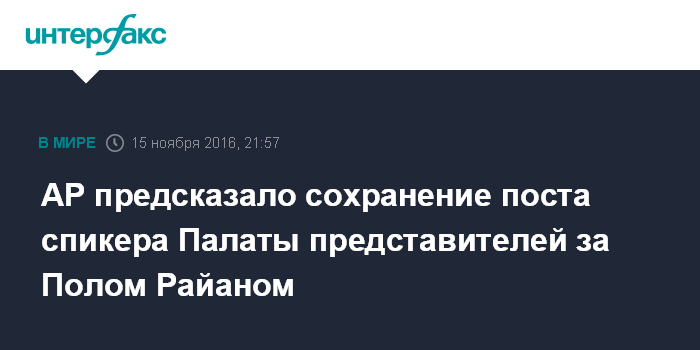 Москва. 15 ноября. INTERFAX.RU - Республиканец Пол Райан, скорее всего, останется на посту спикера после выборов в нижнюю палату Конгресса США - Палату представителей, сообщает во вторник агентство АП.