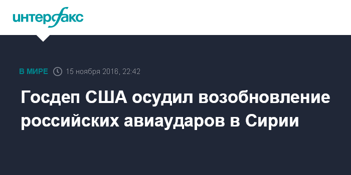 Москва. 15 ноября. INTERFAX.RU - В Вашингтоне осуждают возобновление ударов российских ВКС в Сирии, заявила во вторник представитель госдепа Элизабет Трюдо.