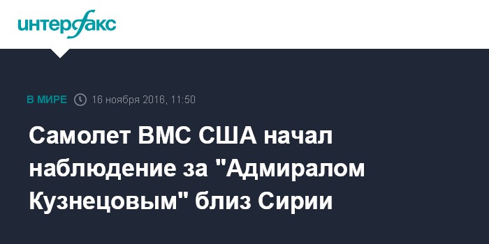 Москва. 16 ноября. INTERFAX.RU - Патрульный противолодочный самолет ВМС США Р-8А Poseidon в среду совершил разведывательный подлет к району дислокации корабельной авианосной группы ВМФ России, в которую входит тяжелый авианесущий крейсер "Адмирал Кузнецов", в Восточном Средиземноморье близ побережья Сирии, свидетельствуют данные западных сайтов, отслеживающих передвижения военной авиации.