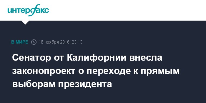 Москва. 16 ноября. INTERFAX.RU - Законопроект об упразднении коллегии выборщиков и переходе к прямым выборам президента внесен на рассмотрение сената США, сообщил в среду телеканал Fox News.