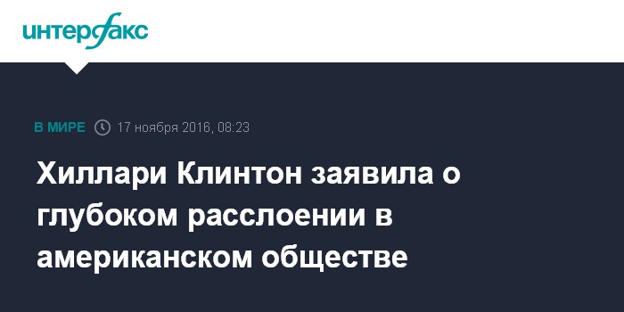 Москва. 17 ноября. INTERFAX.RU - Прошедшие президентские выборы в США выявили серьезные разногласия в американском обществе, заявила проигравшая выборы кандидат от Демократической партии Хиллари Клинтон.