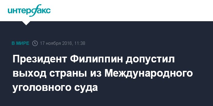 Москва. 17 ноября. INTERFAX.RU - Президент Филиппин Родриго Дутерте заявил, что его страна может покинуть Международный уголовный суд, сообщает в четверг газета The Independent.
