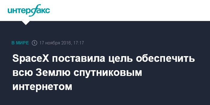 Москва. 17 ноября. INTERFAX.RU - Аэрокосмическая компания SpaceX поставила перед собой цель обеспечить доступ к интернету на всей поверхности Земли сообщает The International Business Times. Для этого SpaceX запланировала вывести на низкую околоземную орбиту 4425 спутников, вещающих в Ku- и Ka-диапазоне.