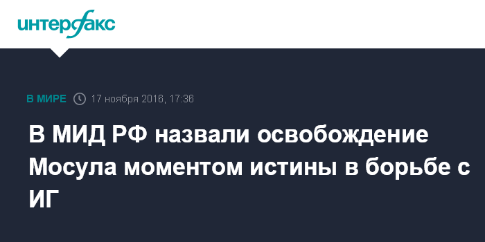 Москва. 17 ноября. INTERFAX.RU - Освобождение иракского Мосула может стать ключевым в борьбе с ИГ (террористическая организация, запрещенная в РФ), заявил спецпредставитель президента РФ по Ближнему Востоку и странам Африки, замглавы МИД РФ Михаил Богданов.