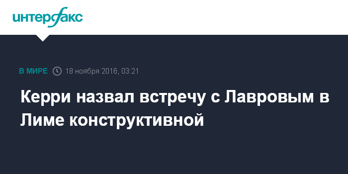 Москва. 18 ноября. INTERFAX.RU - Госсекретарь США Джон Керри дал положительную оценку переговорам с главой МИД РФ Сергеем Лавровым в Лиме.